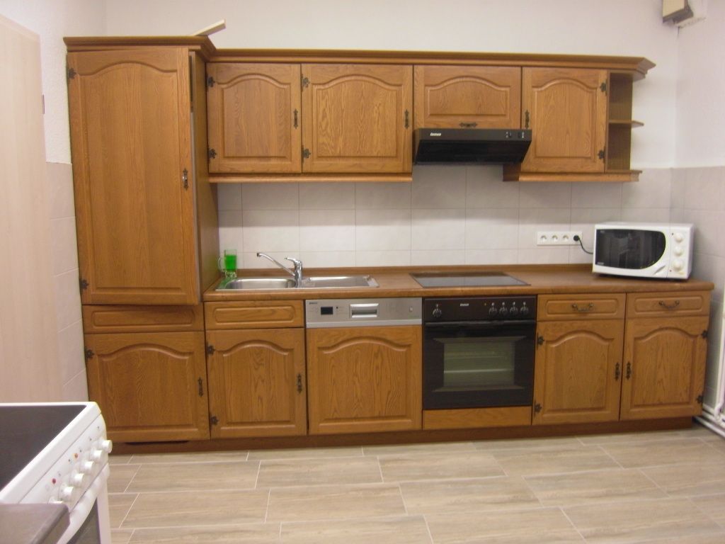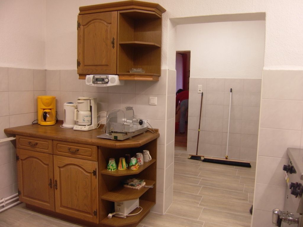 In der angrenzenden Küche kann gemeinsam gekocht werden. Hier stehen Elektroherd mit Backofen, Kühlschrank, Mikrowelle, Wasserkocher und Kaffeemaschine zur Verfügung.