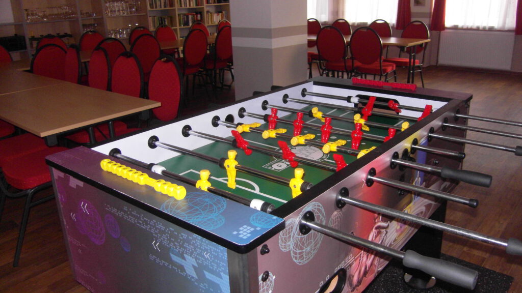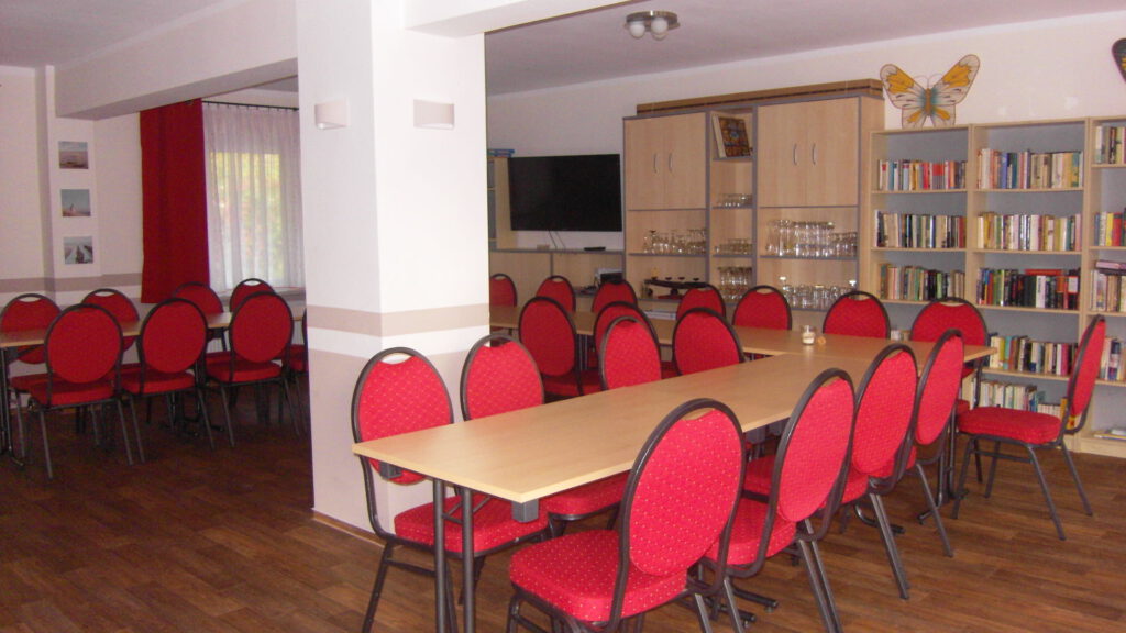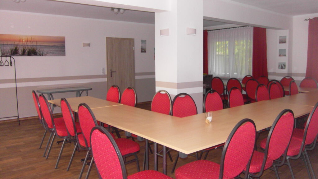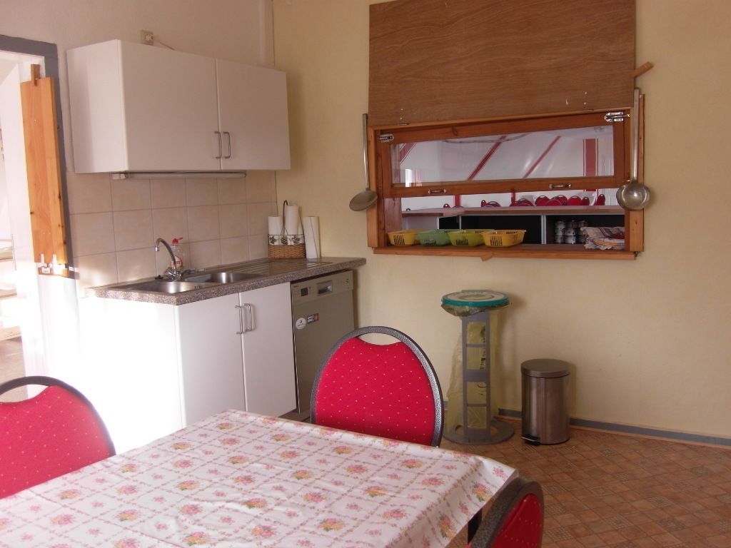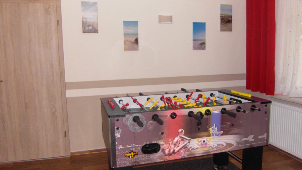 Im Erdgeschoss bietet der kleine Speisesaal etwa 30 Personen Platz für gemütliche Stunden. Zusätzlich stehen in diesem Raum ein Fernseher, eine Stereoanlage, ein Tischkicker, eine kleine Bibliothek und einige Gesellschaftsspiele zur Verfügung, um gemeinsam die Freizeit zu gestalten. Ideal für gemeinsame Abende in größerer Runde oder wenn das Wetter mal nicht so optimal ist.