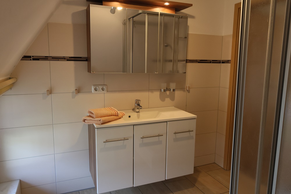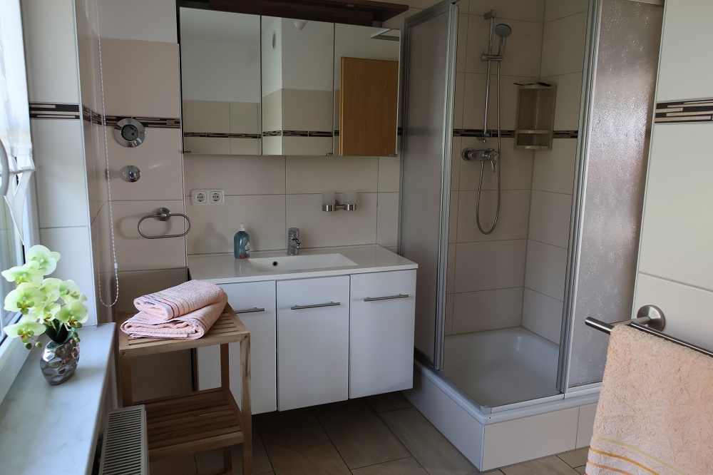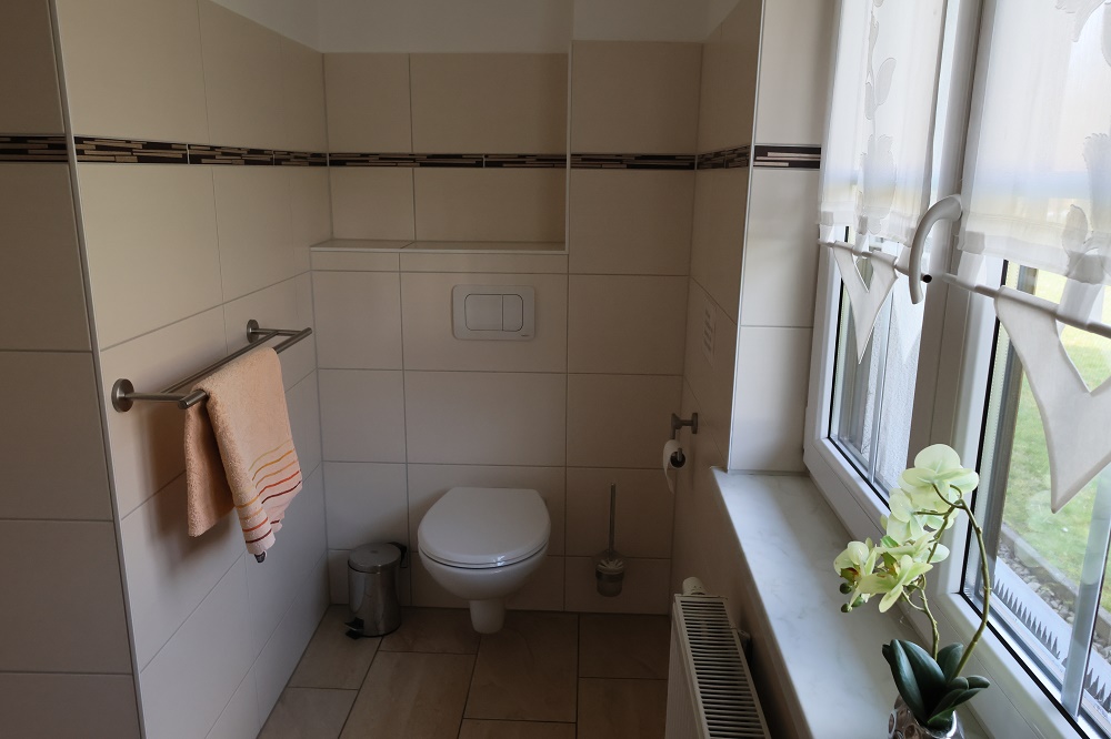 Neben einem großen Bad mit Dusche gibt es noch eine separate Toilette.