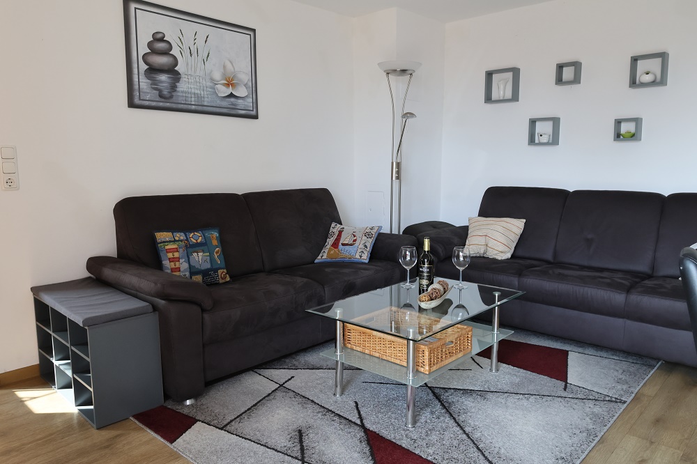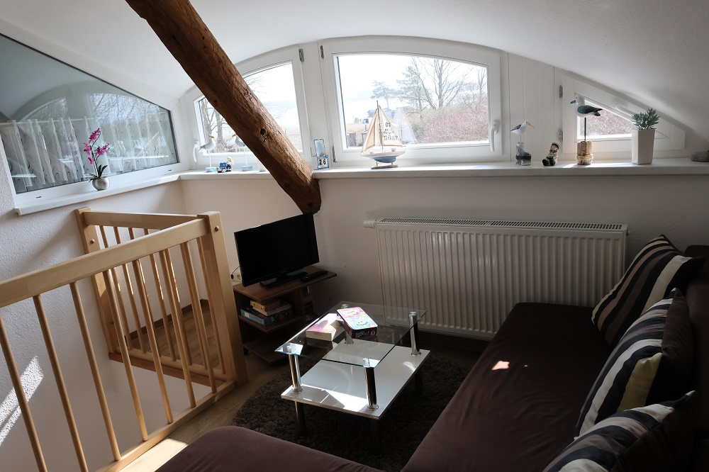 Highlight und Namensgeber der Ferienwohnung ist die Galerie mit traumhaftem Blick auf den Kubitzer Bodden. Die kleine Couchecke dient als weitere Rückzugsmöglichkeit und Aufbettung.