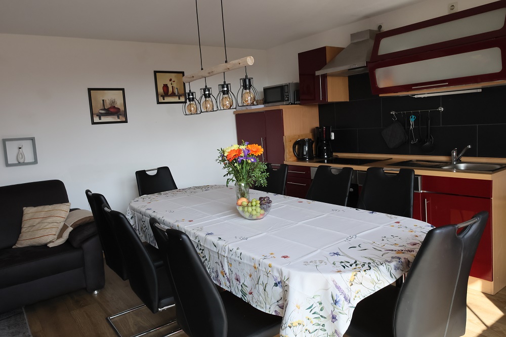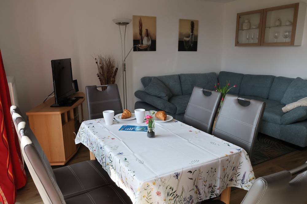 - Wohn-/Essbereich mit TV, Sofa und großem Tisch für bis zu 12 Personen