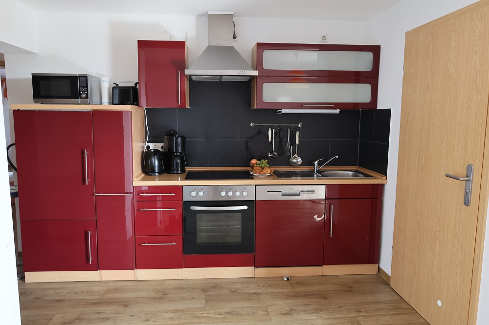 - Komplett ausgestattete Küche mit Geschirrspüler, E-Herd mit Backofen, Kaffeemaschine, Toaster, Wasserkocher, Mikrowelle, Kühlschrank mit Tiefkühlfach