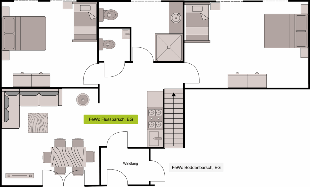 Der „Boddenbarsch“ für 7 bis 8 Personen erstreckt sich über zwei Ebenen. Im Erdgeschoss befindet sich der Wohn-/Essbereich mit Zugang zur Sonnenterasse. Im Obergeschoss befinden sich ein Einzelzimmer und drei Zweibettzimmer, wobei die Betten getrennt oder als Doppelbett stellbar sind. Auf der gleichen Ebene gibt es zwei Bäder mit Dusche.