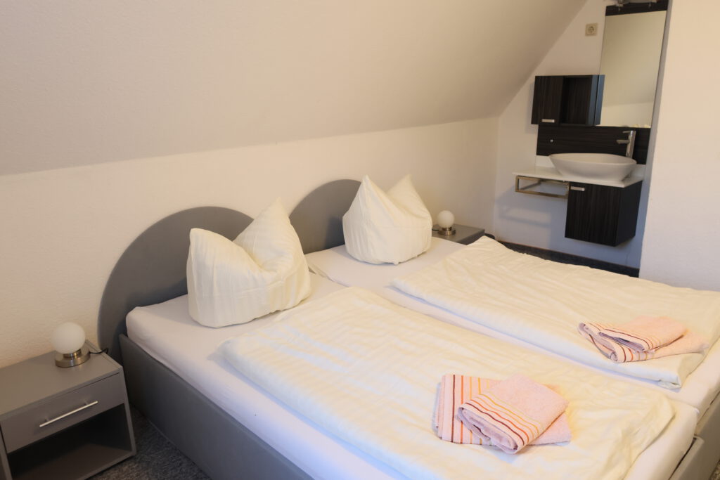 - 2 Schlafzimmer mit Einzelbetten, Schlafsofa und Waschbecken