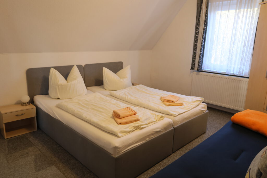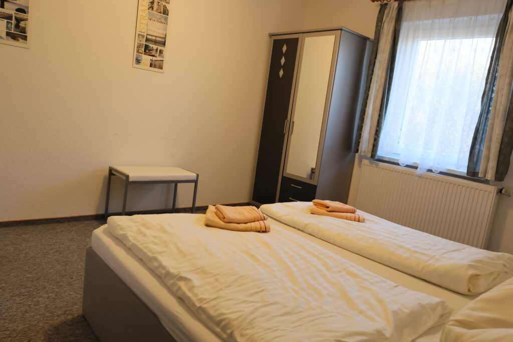 Im Gemeinschaftshaus “Boddenkieker” gibt es im Obergeschoss zwei Schlafzimmer, die gemeinsam mit der Sitzecke im Saal und der Küche sowie mit dem Badezimmer im Erdgeschoss als Ferienwohnung für 4-6 Personen genutzt werden können.