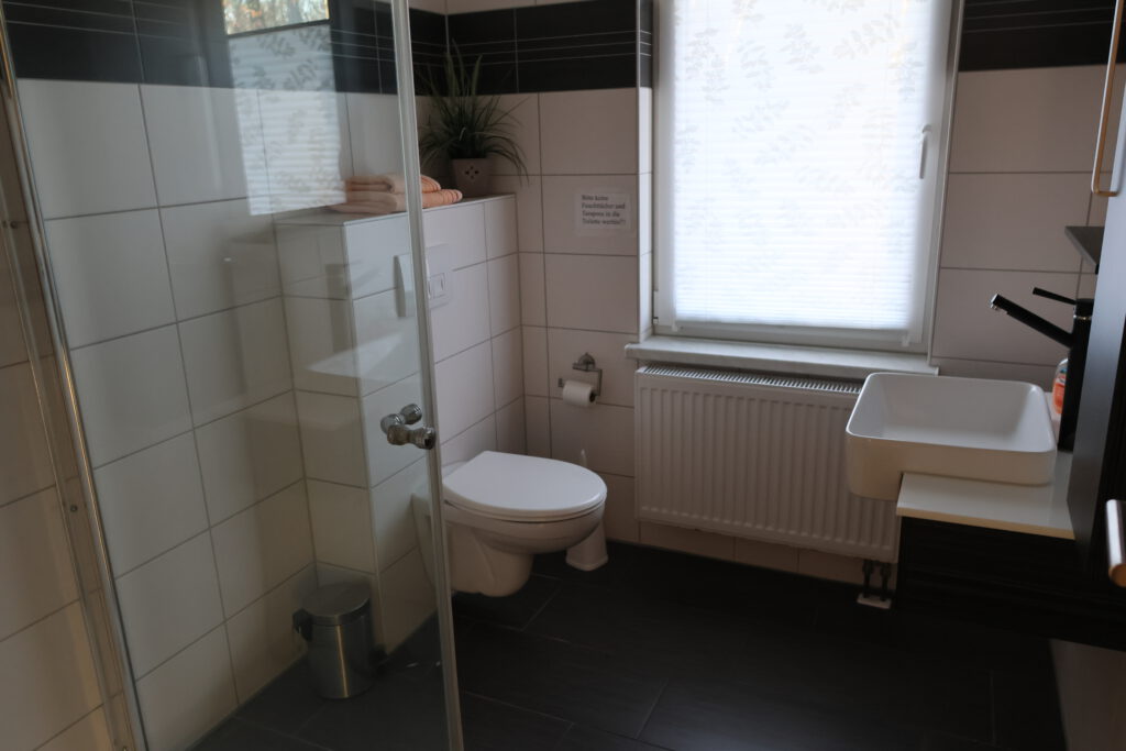 Die Ferienwohnung kann zusätzliche Schlafgelegenheit von Hausgästen oder individuell als Ferienunterkunft genutzt werden. Die Wohnung befindet sich im ersten Stock des “Boddenkieker” und ist über einen separaten Eingang von der zugehörigen möblierten Terrasse aus erreichbar. Zur Ferienwohnung gehören 2 Schlafzimmer mit jeweils zwei Einzelbetten (eines davon mit zusätzlicher Schlafliege) und Waschtisch, ein riesiges Saal-Wohnzimmer mit gemütlicher Ledergarnitur und einem großen Plasma-TV. Die Küche ist ausgestattet mit Geschirrspüler, Gasherd, Mikrowelle, Kaffeemaschine, Wasserkocher und Toaster. Das moderne Bad mit Dusche befindet sich im Erdgeschoss.